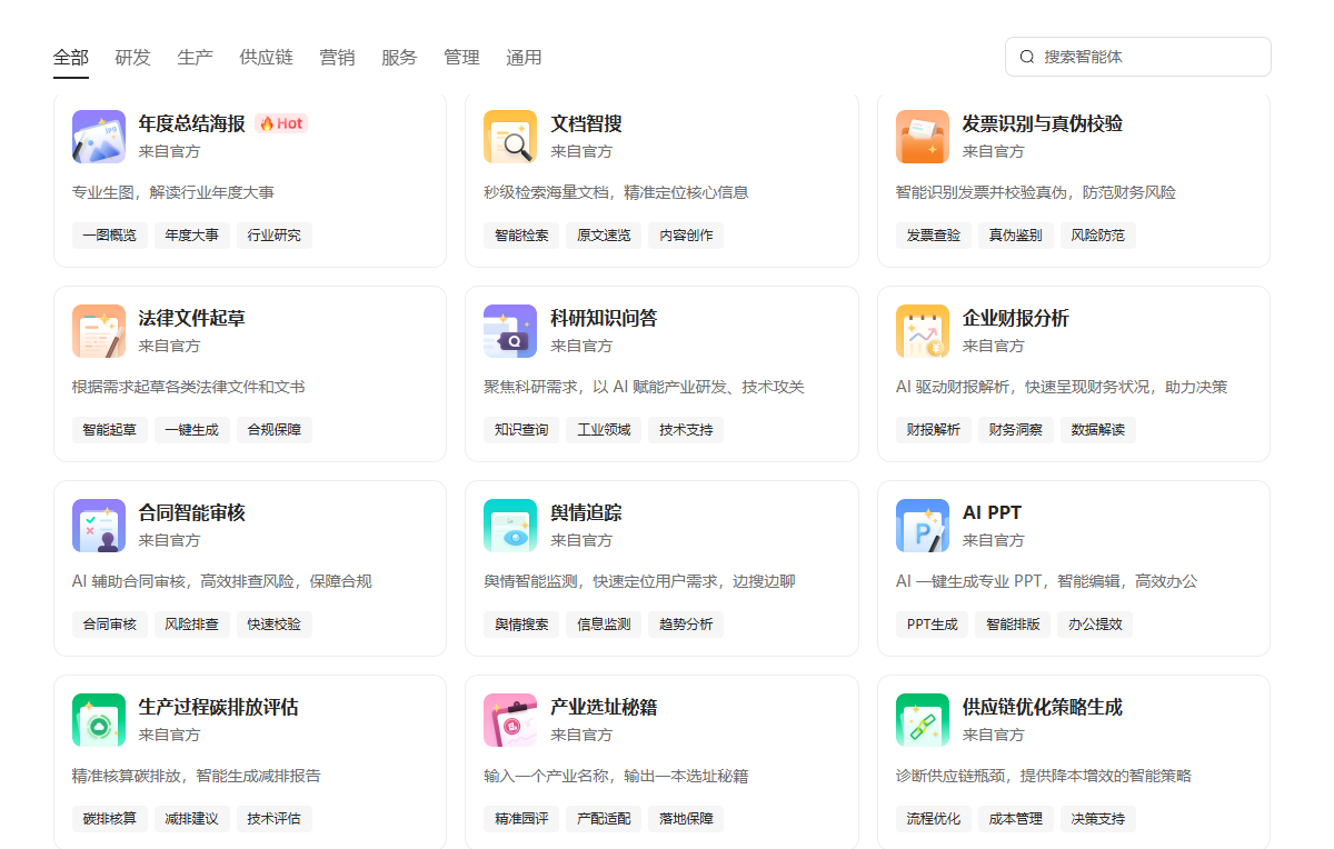 目前,万联摩尔智能体广场已推出超过20个专用智能体,它们如同乐高积木,既能独立解决采购、销售、财务等具体问题,又能灵活组合,应对供应链协同、产业布局规划等系统性挑战。这使万联摩尔超越了“小而美”的垂直解决方案,成为一个能为任何产业门类提供深度智能服务的 “大而精”超级入口。