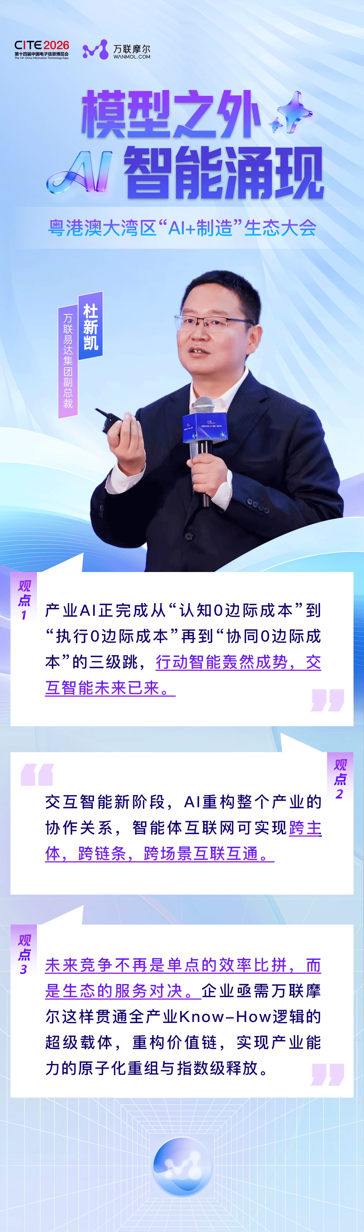 4月9日至11日,第十四届中国电子信息博览会(CITE2026)在深圳举行。万联易达集团副总裁杜新凯在CITE2026“粤港澳大湾区‘AI+制造’生态大会”发表题为《打造全产业AI超级载体,重塑产业智能协同新范式》的主旨演讲,深入阐述了对未来产业AI发展的战略思考。